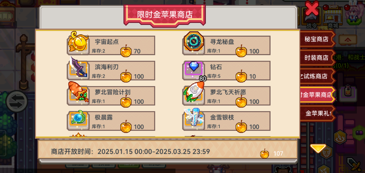 a.限时金苹果商店每2个版本进行一次商品轮换与库存刷新,本期持续时间为:2025.1.15更新后---2025.03.25 23:59。下一期开放时间为2025年3月版本更新后。