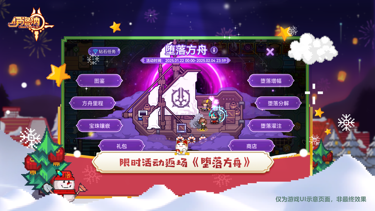 b.新春活动地宫限时开启,冒险家们在活动期间与狗叔对话即可开启活动地宫!通关可获得新春礼盒等好礼!活动期间每日可参与一次,开启时间:2025.01.15更新后---2025.02.04 23:59;